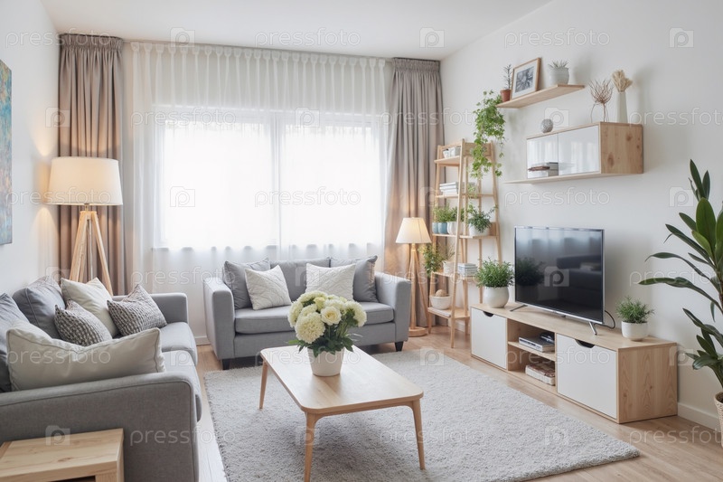 Скандинавская гостиная с современным минималистическим декором и естественным освещением