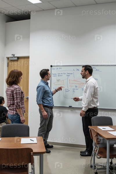 Группа молодых белых коллег-взрослых, обсуждающих проект на доске