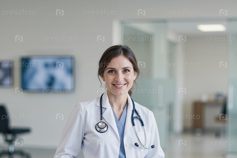 Портрет молодой взрослой белокожей женщины врач улыбается в коридоре больницы