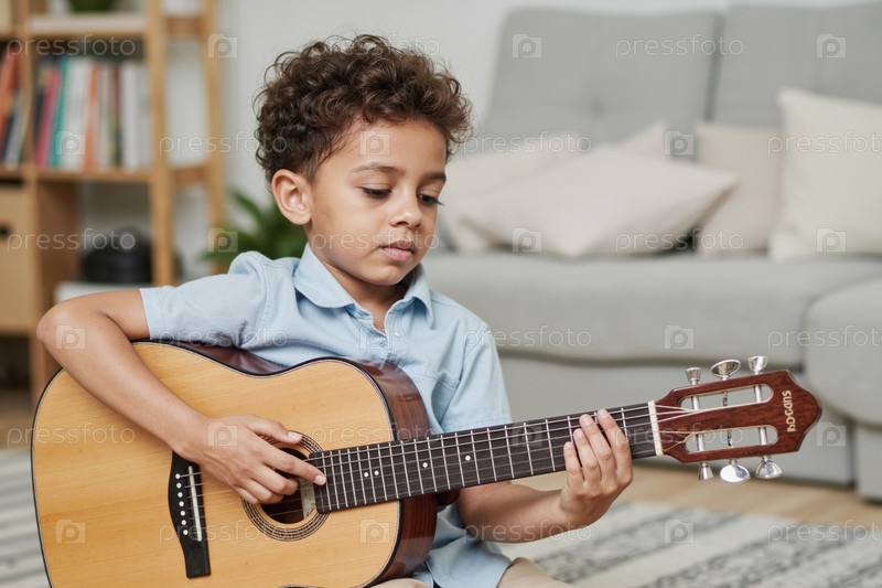 Молодой чернокожий парень играет на акустической гитаре, сидя в гостиной