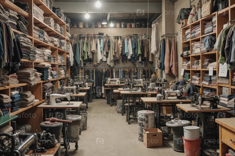 Рабочая мастерская по пустому шитью с швейными машинами и организованными стойками для одежды
