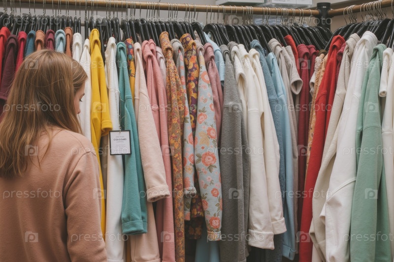 Молодая белая женщина просматривает красочную стойку для одежды в розничном магазине