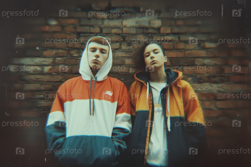 Юный белый мальчик и юная белая девочка стоят на кирпичной стене