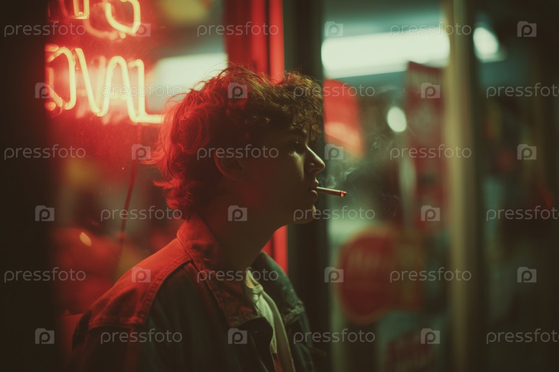 Кавказский подросток-мальчик курит сигарету снаружи магазина ночью