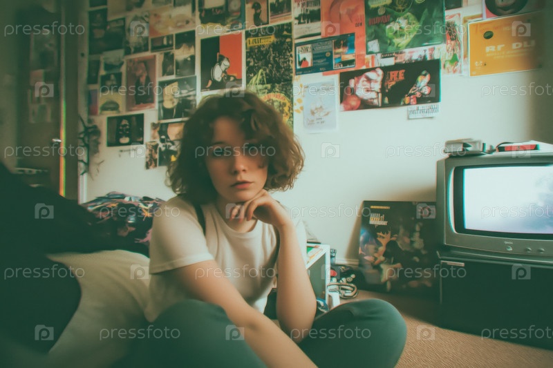 Портрет белокожей девочки-подростка, сидящей в спальне и смотрящей на камеру