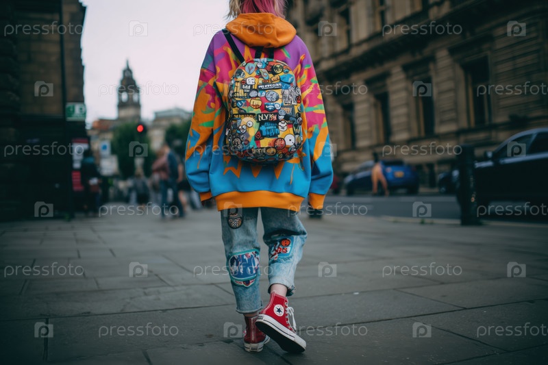 Подростковая девушка с красочным рюкзаком, идущая по городской улице днем