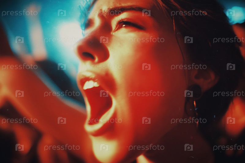 Молодая белая женщина громко приветствует во время концерта в яркой атмосфере