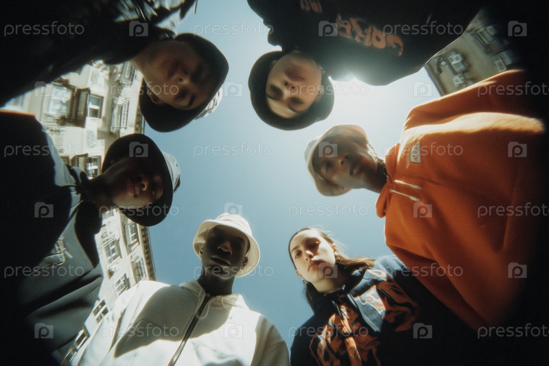 Группа разнообразных подростков, стоящих в кругу и смотрящих на улицу