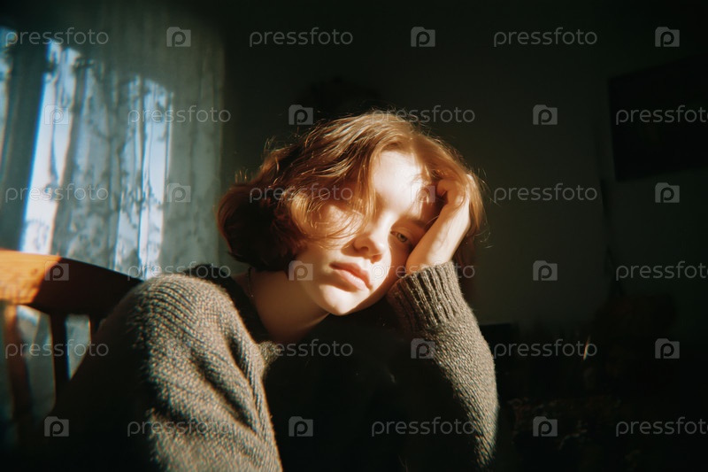Портрет белокожей девочки-подростка, сидящей в помещении и отдыхающей головой на руке
