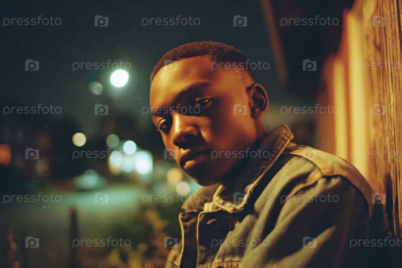 Портрет чернокожего мальчика-подростка, смотрящего на камеру ночью на улице