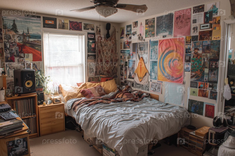 Уютная спальня украшена плакатами и художественными принтами, отражающими творческую личность