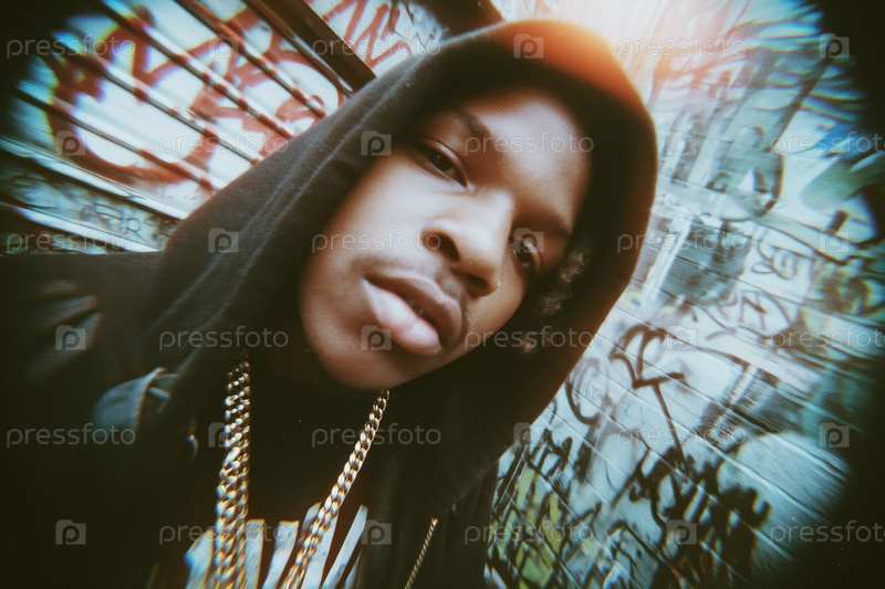 Портрет молодого взрослого чернокожего мужчины в хаусине, стоящего возле стены граффити