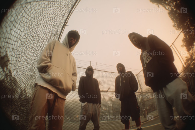 Группа молодых чернокожих мужчин, стоящих на открытом воздухе возле забора с цепным звеном в Сансет