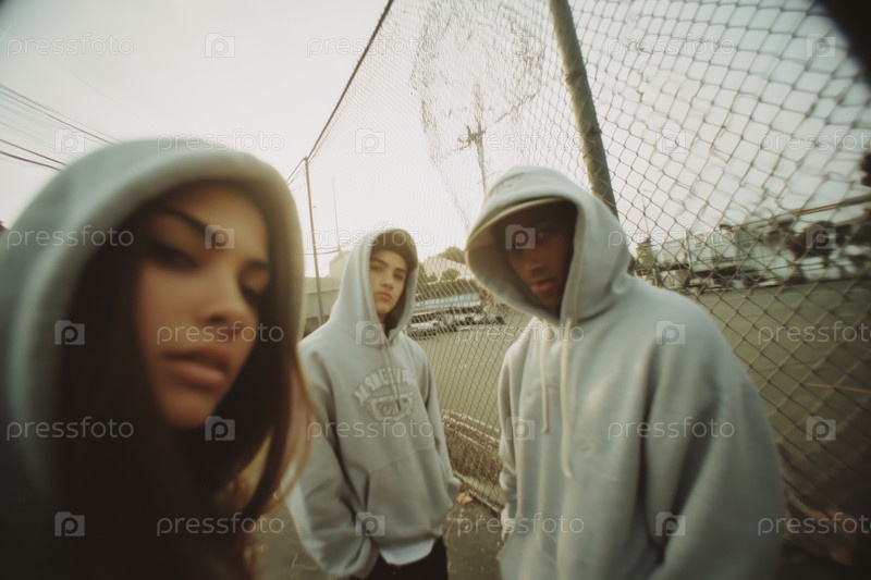 Мультиэтнические подростки, одетые в хаусики, стоящие возле цепного забора на открытом воздухе
