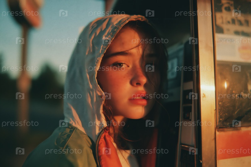 Портрет подростковой белой девушки, использующей мобильный телефон на улице во время захода солнца