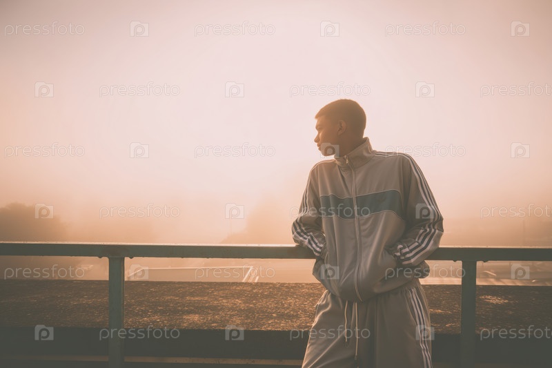 Чернокожий подросток, стоящий на улице и опирающийся на перила при восходе солнца