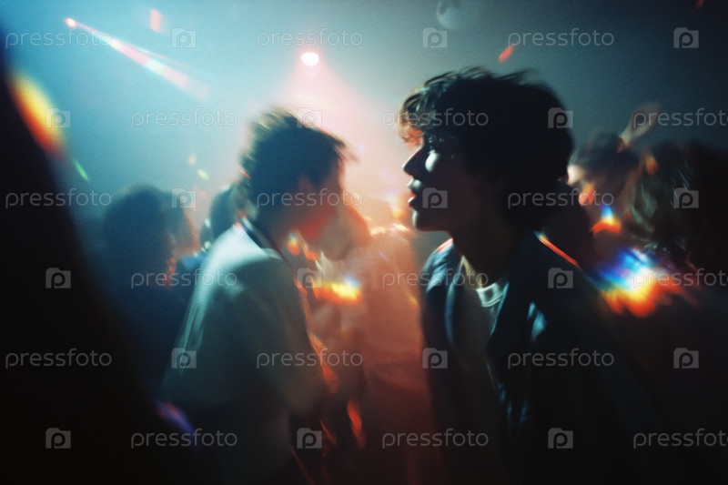 Молодой взрослый белый мужчина танцует среди толпы на вечеринке в ночном клубе