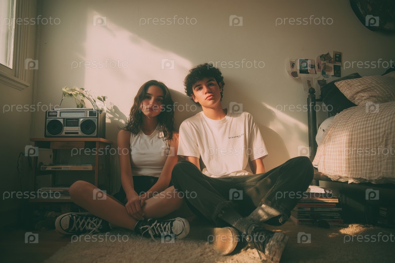 Подростковая белая девушка и подросток-белый мальчик сидят на полу в спальне, расслабляясь