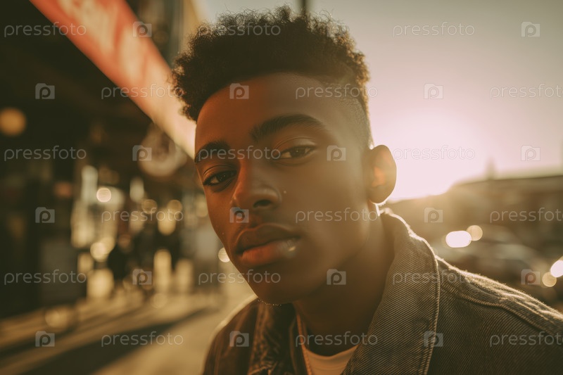 Портрет молодого чернокожего мужчины, уверенно смотрящего на улицу во время захода солнца
