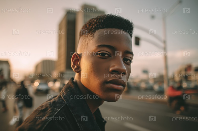 Портрет чернокожего мальчика-подростка, уверенно глядящего на городскую улицу при закате