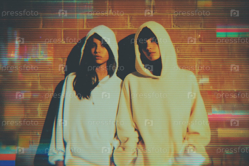 Два подростка стоят на кирпичной стене, носят толстовки и выглядят серьезно