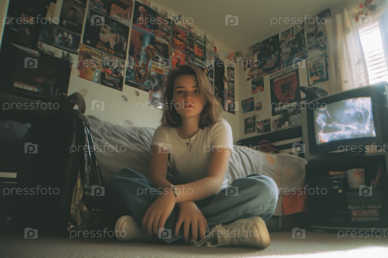 Портрет белокожей девочки-подростка, сидящей с перекрещенными ногами в спальне