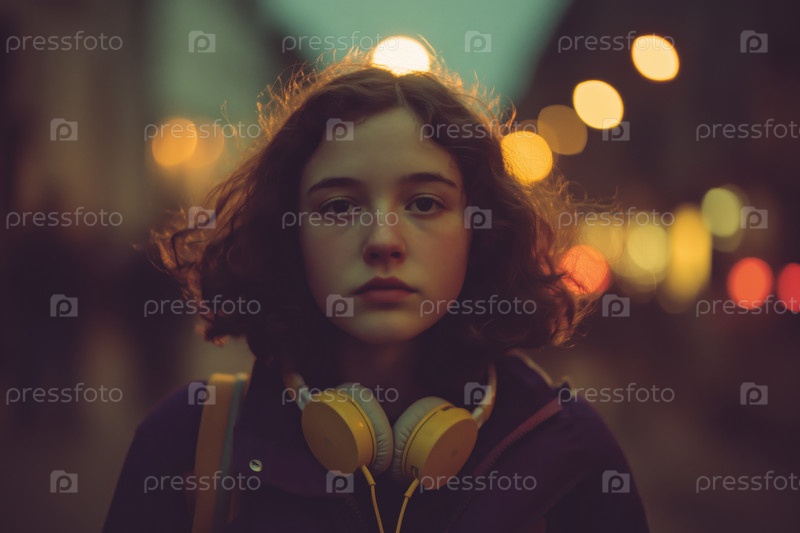 Портрет белокожей девочки-подростка с наушниками, стоящей на улице вечером