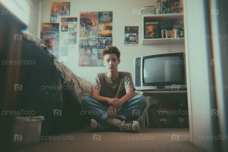 Портрет белого мальчика-подростка, сидящего с крестовыми ногами на полу в спальне