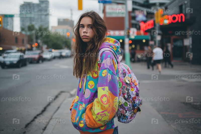 Портрет подростковой белой девушки, стоящей на городской улице в рюкзаке
