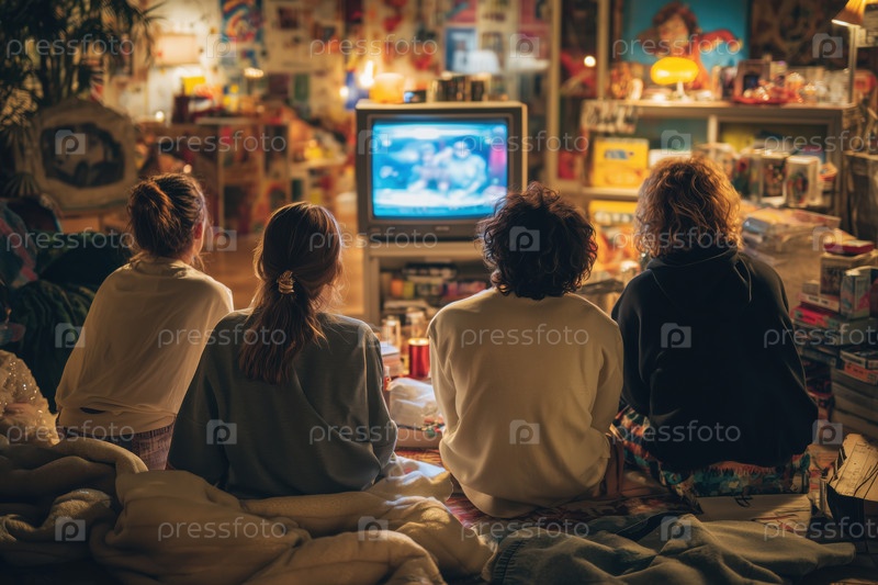 Группа подростков, смотрящих телевизор вместе в уютной обстановке ретро спальни
