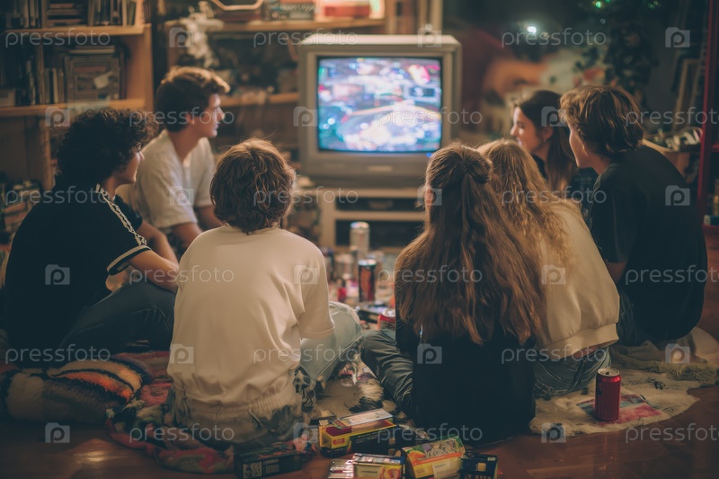Группа подростков, отдыхающих в помещении, смотрящих телевизор и общающихся вместе