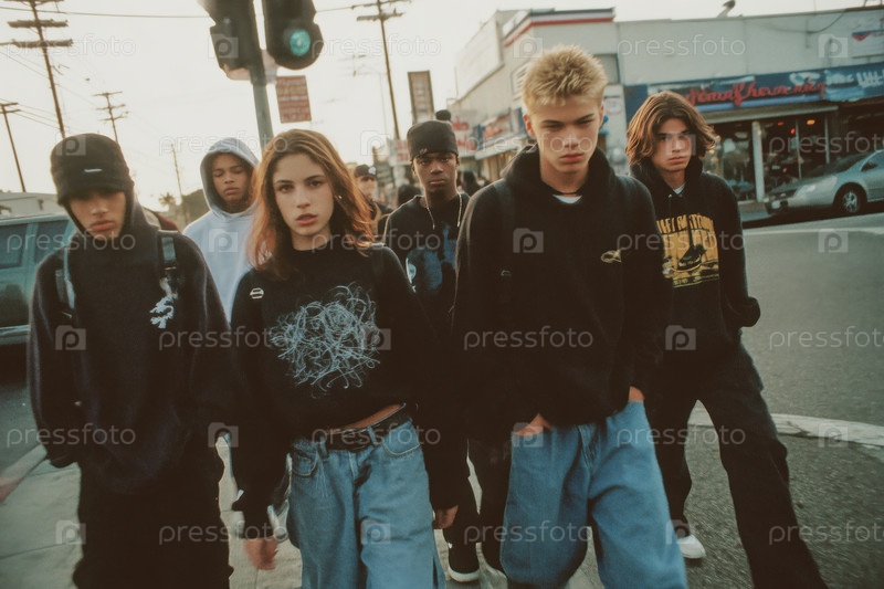 Группа подростков, идущих по городской улице и пересекающей на закате