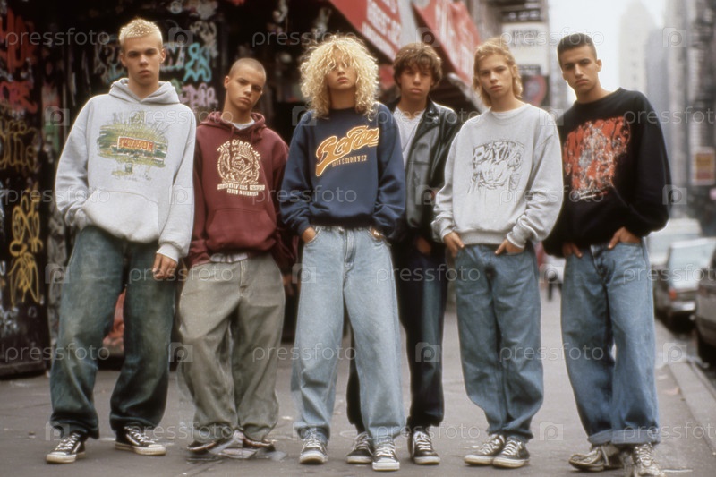 Группа подростков, стоящих на городской улице и позирующих перед камерой на открытом воздухе