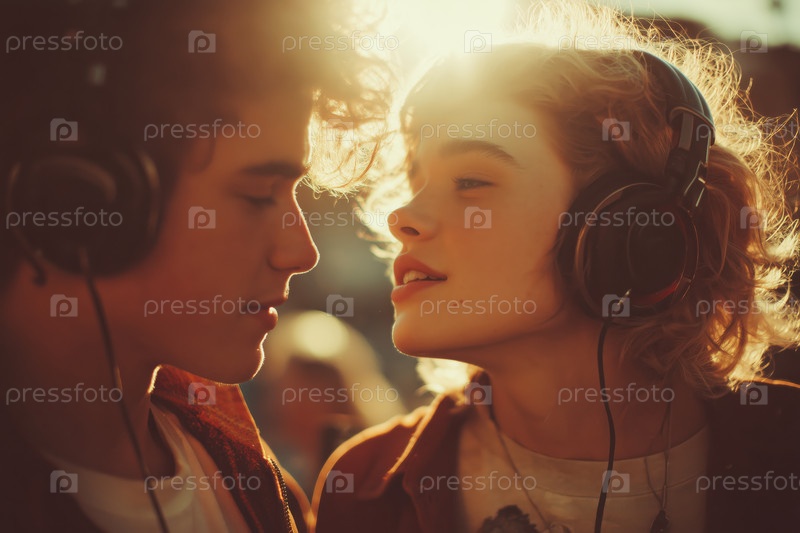 Юношеский белый мальчик и девочка слушают музыку вместе на свежем воздухе