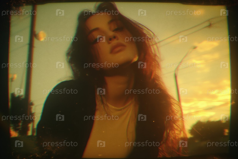 Портрет молодой взрослой белокожей женщины, позирующей на улице во время захода солнца