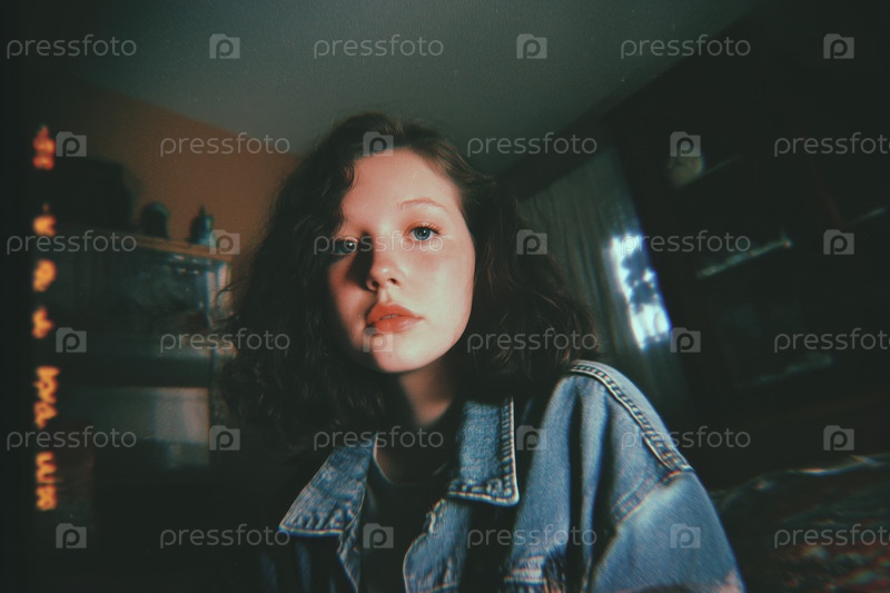 Портрет белокожей девочки-подростка, глядящей на камеру в помещении и созерцающей