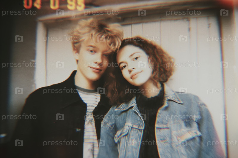 Портрет белого мальчика-подростка и девочки-подростки, улыбающихся и склонившихся вместе