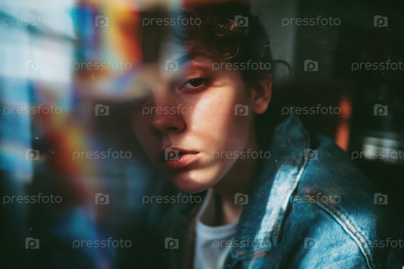 Портрет белокожей девочки-подростка, глядящей через стекло с отражающим светом