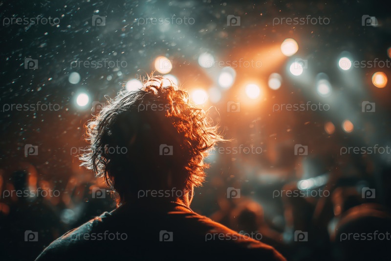 Молодой взрослый белый мужчина наслаждается живым музыкальным концертом в яркой атмосфере
