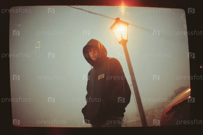 Юношеский азиатский мальчик стоит на улице под светофором во время вечернего тумана