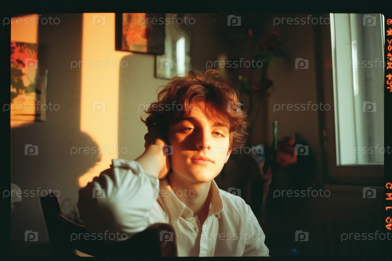 Портрет белого мальчика-подростка, сидящего в помещении и смотрящего на камеру