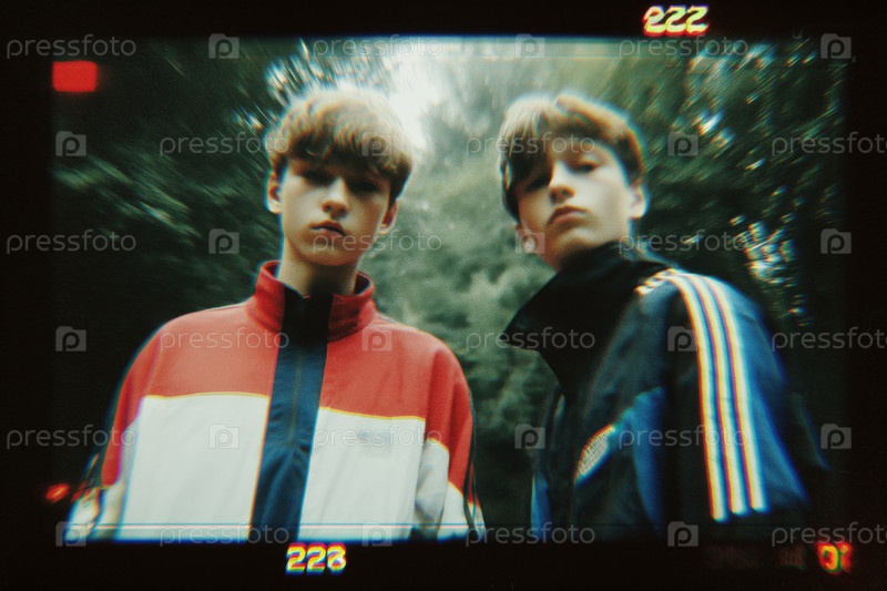 Портрет двух подростковых белых мальчиков, стоящих на улице и смотрящих в камеру