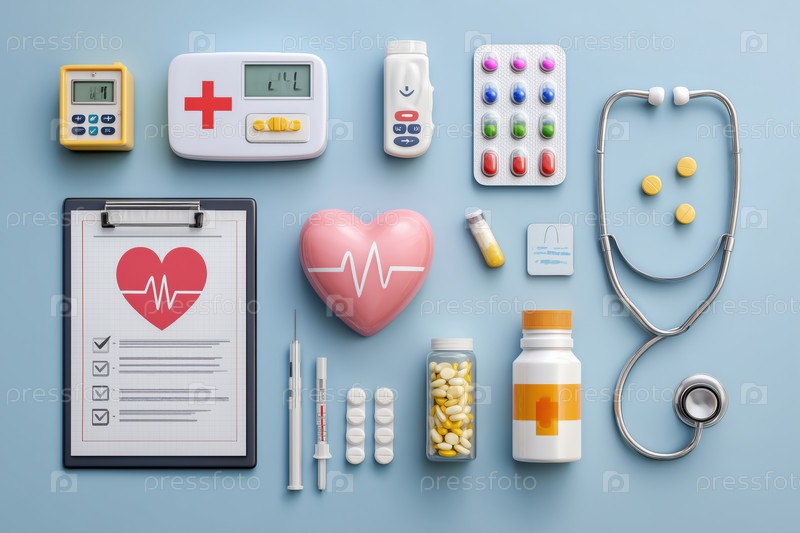 Медицинское оборудование и лекарства расположены по таблице, иллюстрирующей концепцию здравоохранения