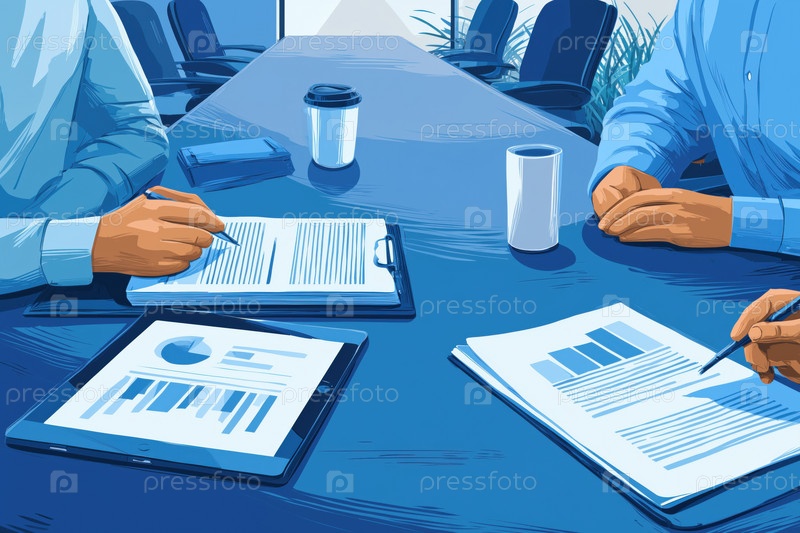 Два белых мужчины средних лет анализируют финансовые отчеты во время деловой встречи