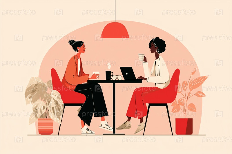 Две молодые взрослые черные женщины сидят за столом, пьют кофе и разговаривают