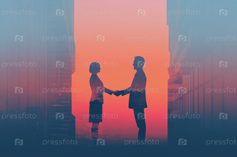 Молодая взрослая белая женщина и мужчина пожали друг другу руки в современной городской обстановке
