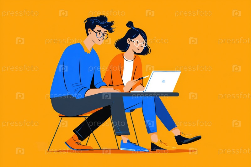 Молодой взрослый кавказский мужчина и азиатская женщина сотрудничают с помощью ноутбука