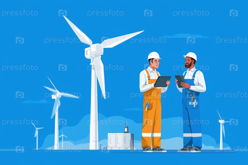 Два молодых инженера-взрослых сотрудничают на ветровой электростанции с помощью цифровых планшетов