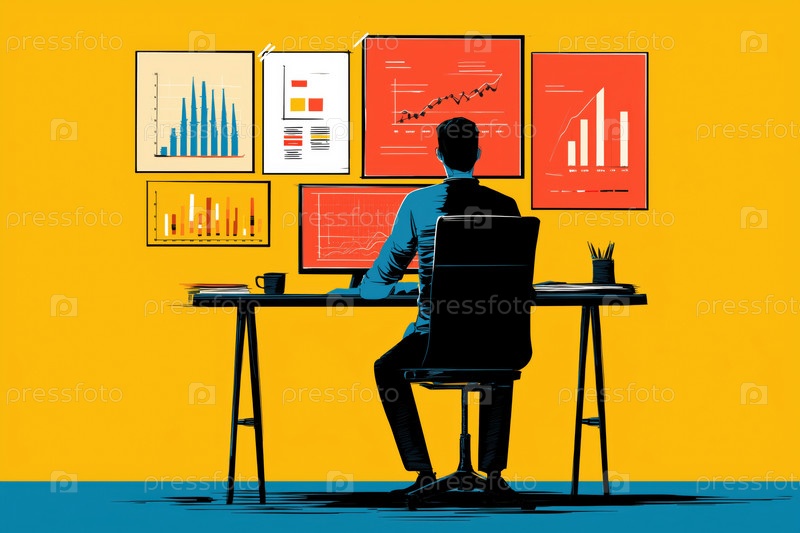 Молодой взрослый кавказский мужчина анализирует финансовые данные на компьютере в офисной обстановке