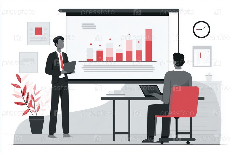 Молодой взрослый кавказский мужчина представляет бизнес-данные коллеге на офисной встрече